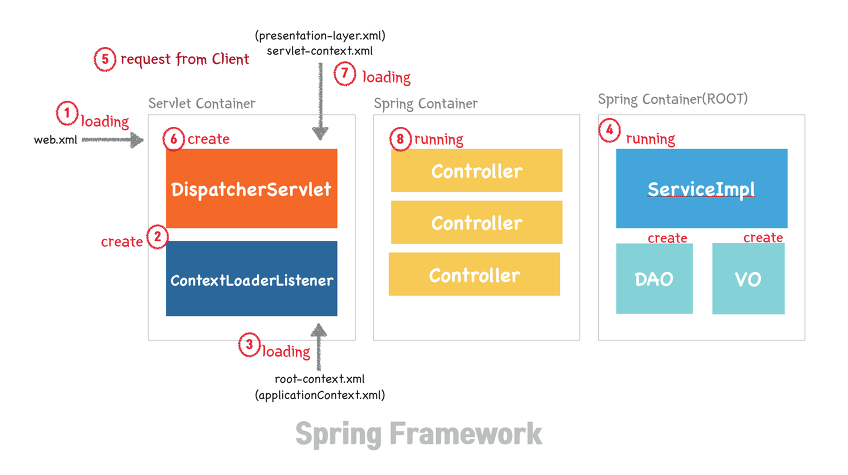 - 스프링 프레임워크에서 POJO 만으로 어떻게 동작 하지? 내부에서 어떤 서블릿 클래스들이 동작하지? 라는 의문이 든다면 아래 그림을 참조 하자 !