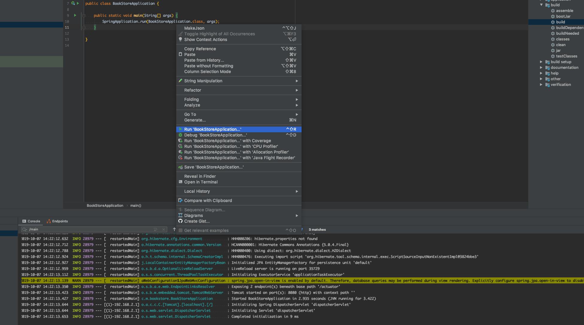 해당 컨트롤러 부분을 추가한 이후, BookStoreApplication 에서 우클릭 Run 을 통해 실행하여 보자.